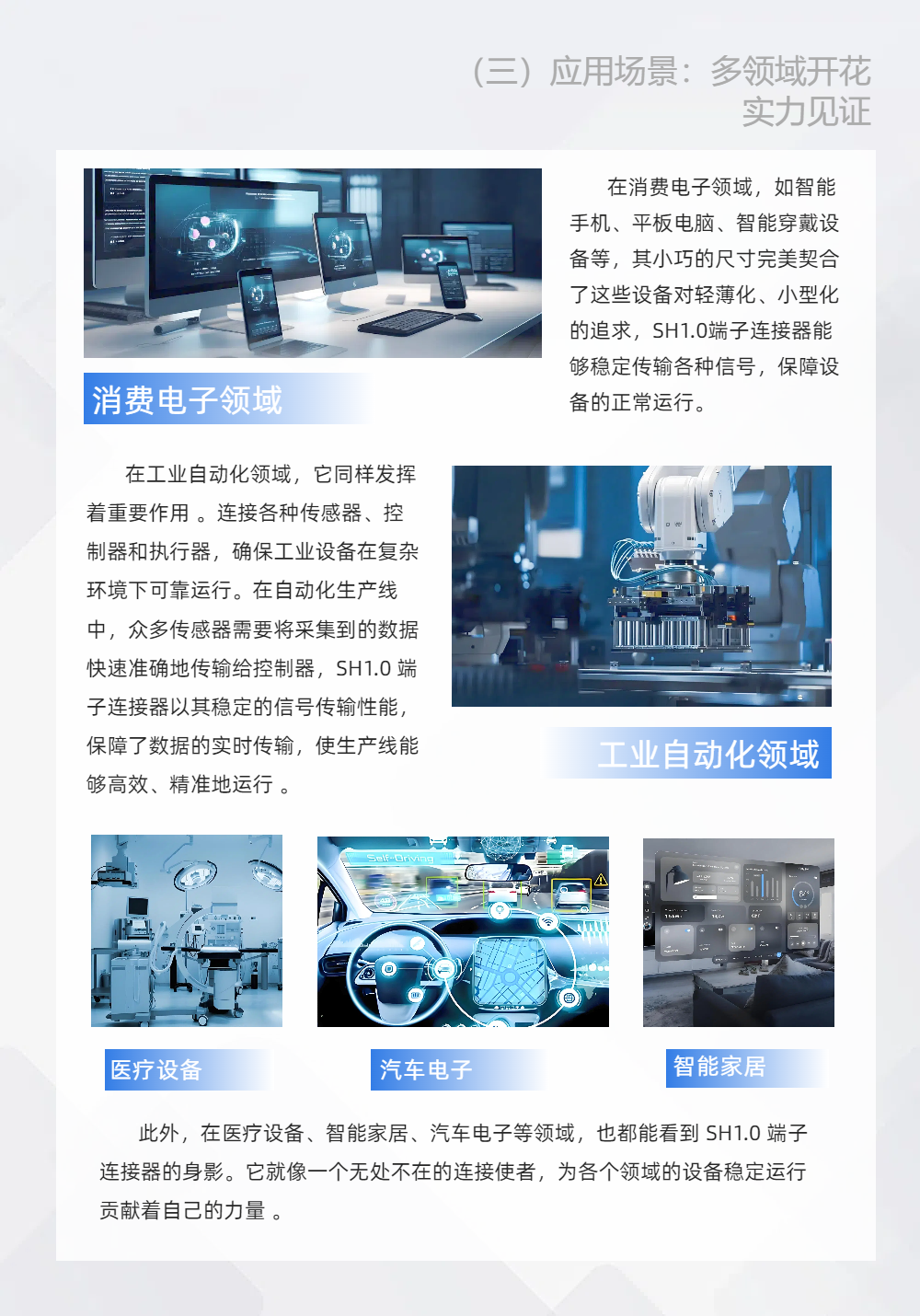 在消费电子领域,如智能手机、平板电脑、智能穿戴设备等,其小巧的尺寸完美契合了这些设备对轻薄化、小型化的追求,SH1.0端子连接器能够稳定传输各种信号,保障设备的正常运行。