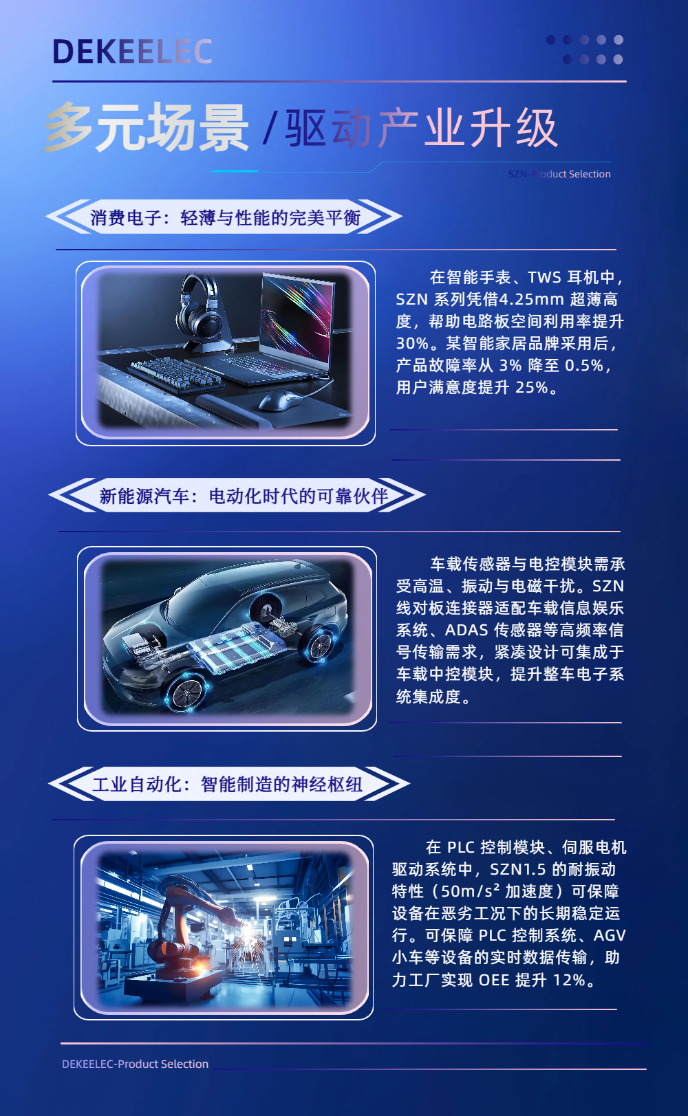新能源汽车:电动化时代的可靠伙伴车载传感器与电控模块需承受高温、振动与电磁干扰。SZN线对板连接器适配车载信息娱乐系统、ADAS 传感器等高频率信号传输需求,紧凑设计可集成于车载中控模块,提升整车电子系